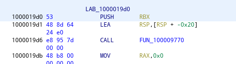 The starting labyrinth is bigger than Lazarus so I had to begin the maze from the end, searching the string "hello world" and then finding the string references:There are two ways to follow the references in Ghidra, one is [ctrl] + [shift] + F but there is other trick which is simply clicking the green references texts on the disassembly.